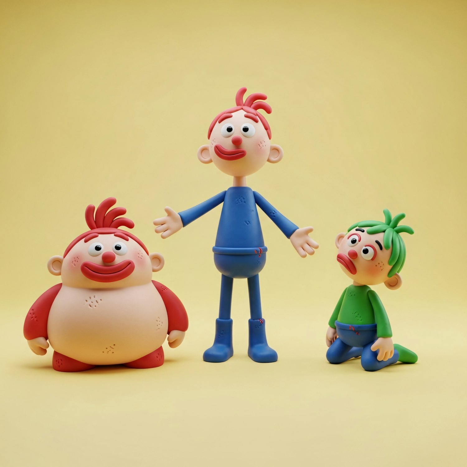 Three colorful claymation-style characters with exaggerated features stand against a yellow background, showcasing playful and quirky designs.