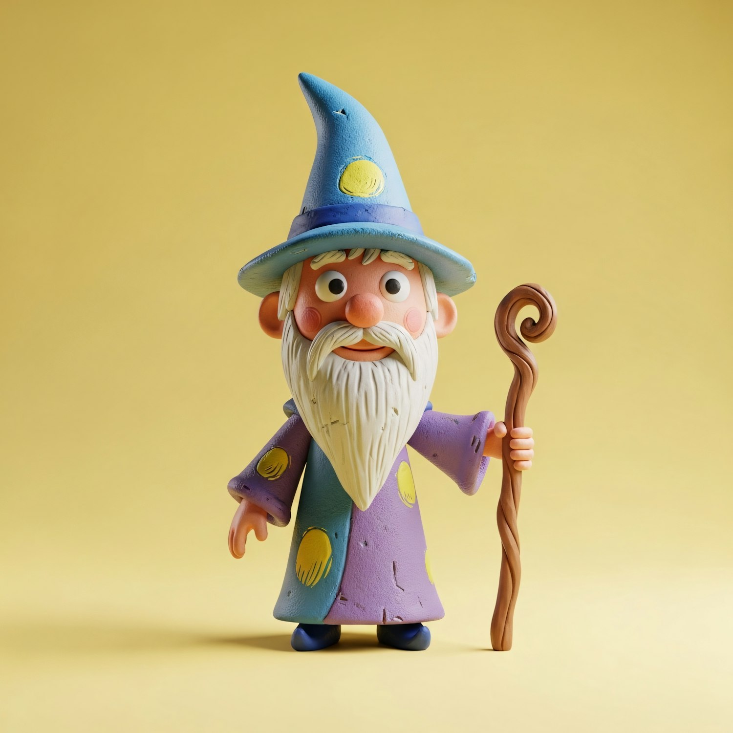 A colorful claymation-style wizard with a blue hat, purple robe, and wooden staff, set against a bright yellow background.