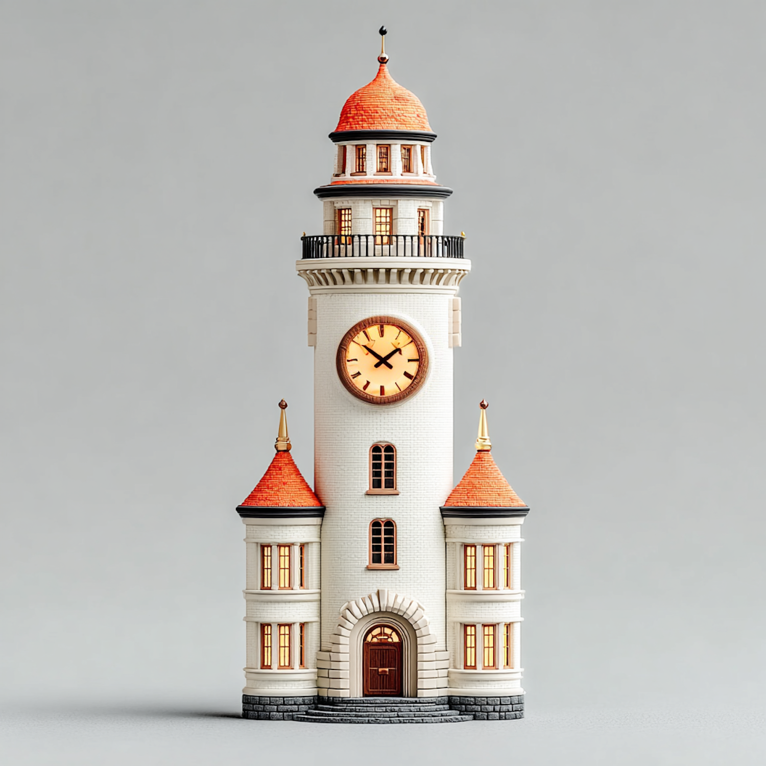 A beautifully designed clock tower with red-orange tiled roofs and a glowing clock face, showcasing a blend of classical and fairy-tale styles.