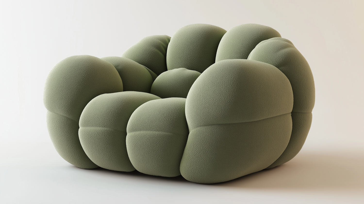 A cozy, cloud-like green armchair with a unique, rounded design and textured fabric, perfect for modern interiors.