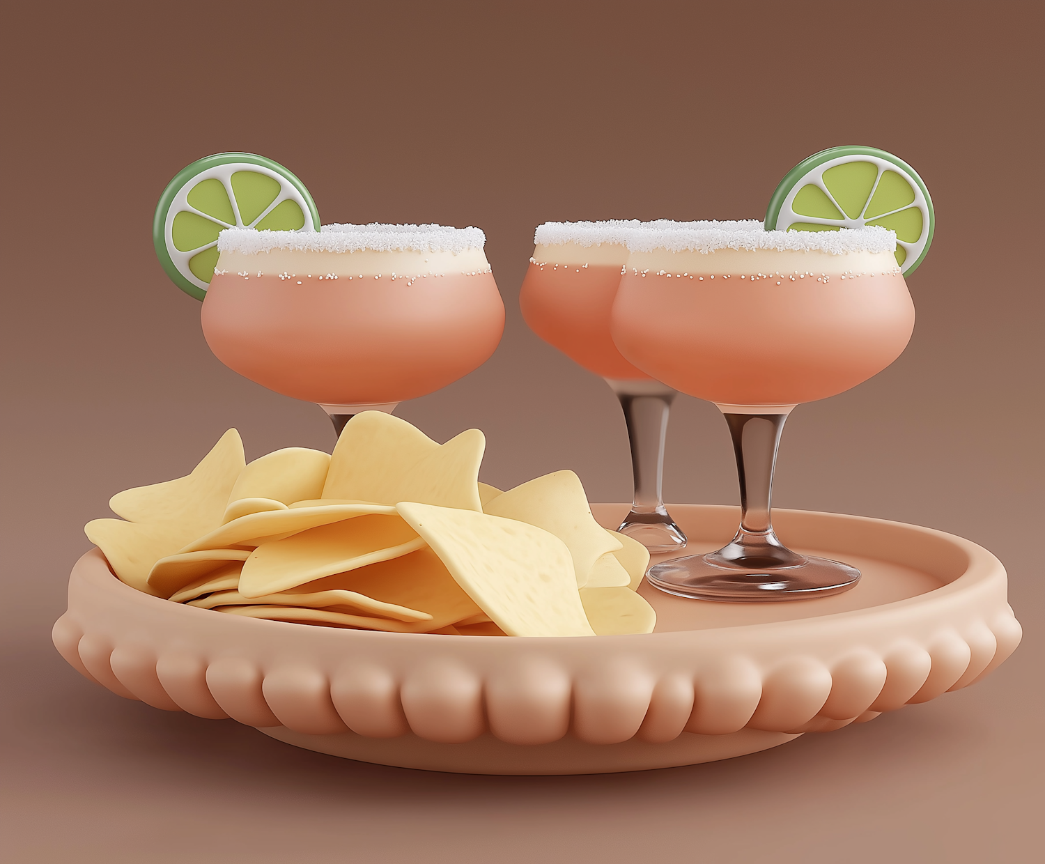 Three peach-colored cocktails with lime garnishes and tortilla chips on a decorative tray, set against a warm brown background.