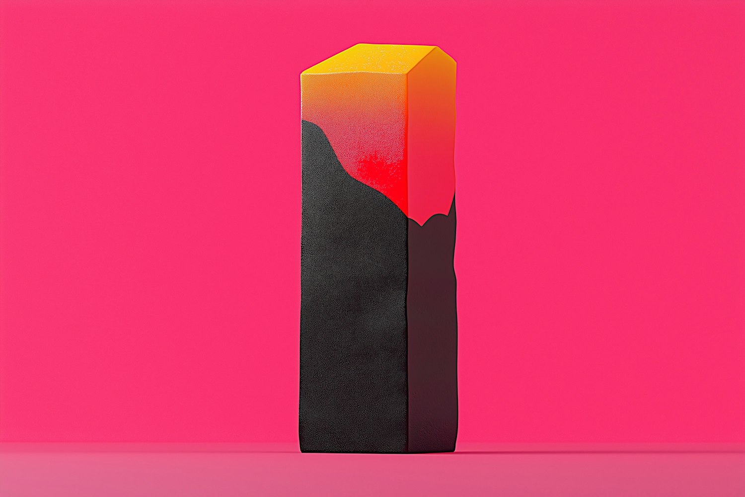 Abstract block with gradient colors against a vibrant pink background, featuring bold contrasts and modern design.