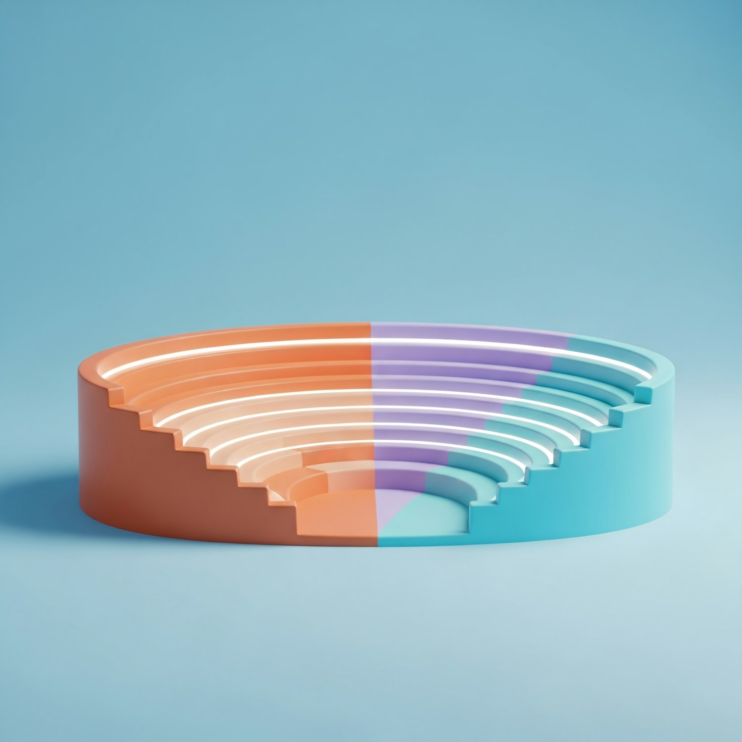 A vibrant 3D-rendered circular staircase with orange, purple, and blue segments against a light blue background.