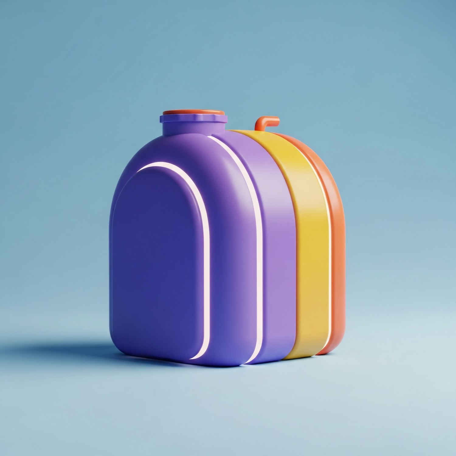 A vibrant 3D-rendered object with a modern design, featuring purple, yellow, and orange tones against a clean blue background.