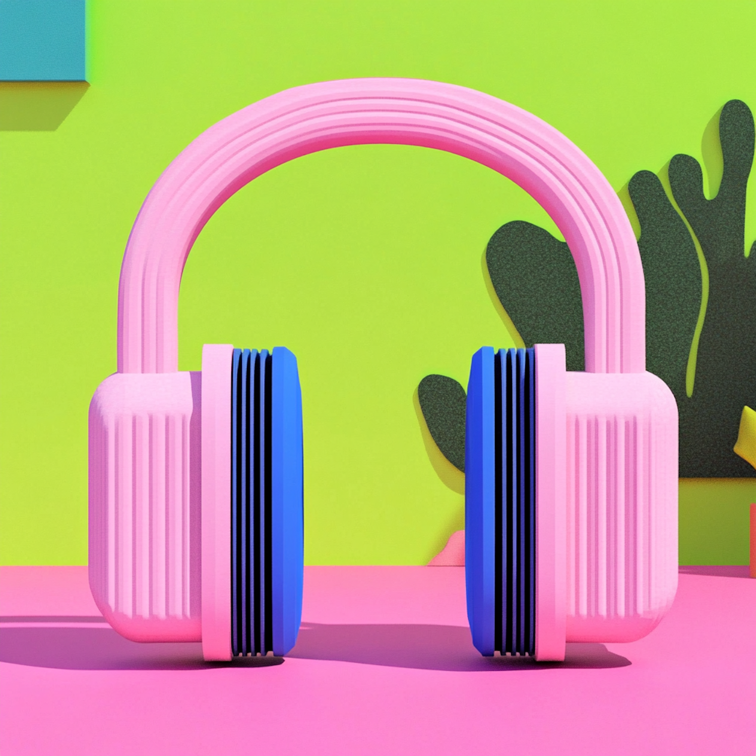 Bright pink and blue 3D headphones in a playful, colorful setting with lime green and pink background and abstract shapes.