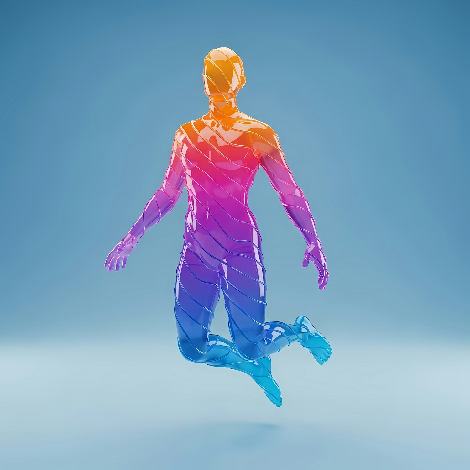 A vibrant 3D-rendered human figure with a gradient of orange, pink, and blue hues, floating against a light blue background.