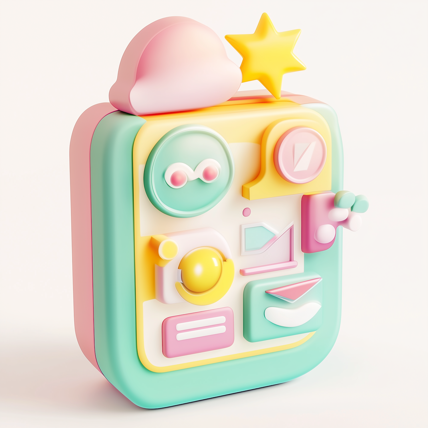 Colorful 3D illustration of a playful gadget with pastel shapes and symbols, resembling a whimsical user interface.
