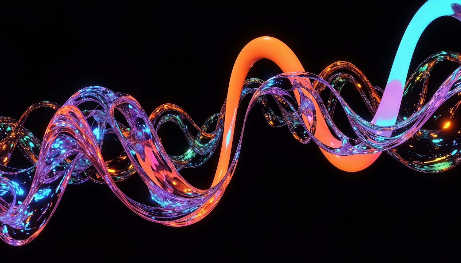 Vibrant abstract image with glowing neon ribbons in orange, blue, and purple against a black background, creating a dynamic visual effect.