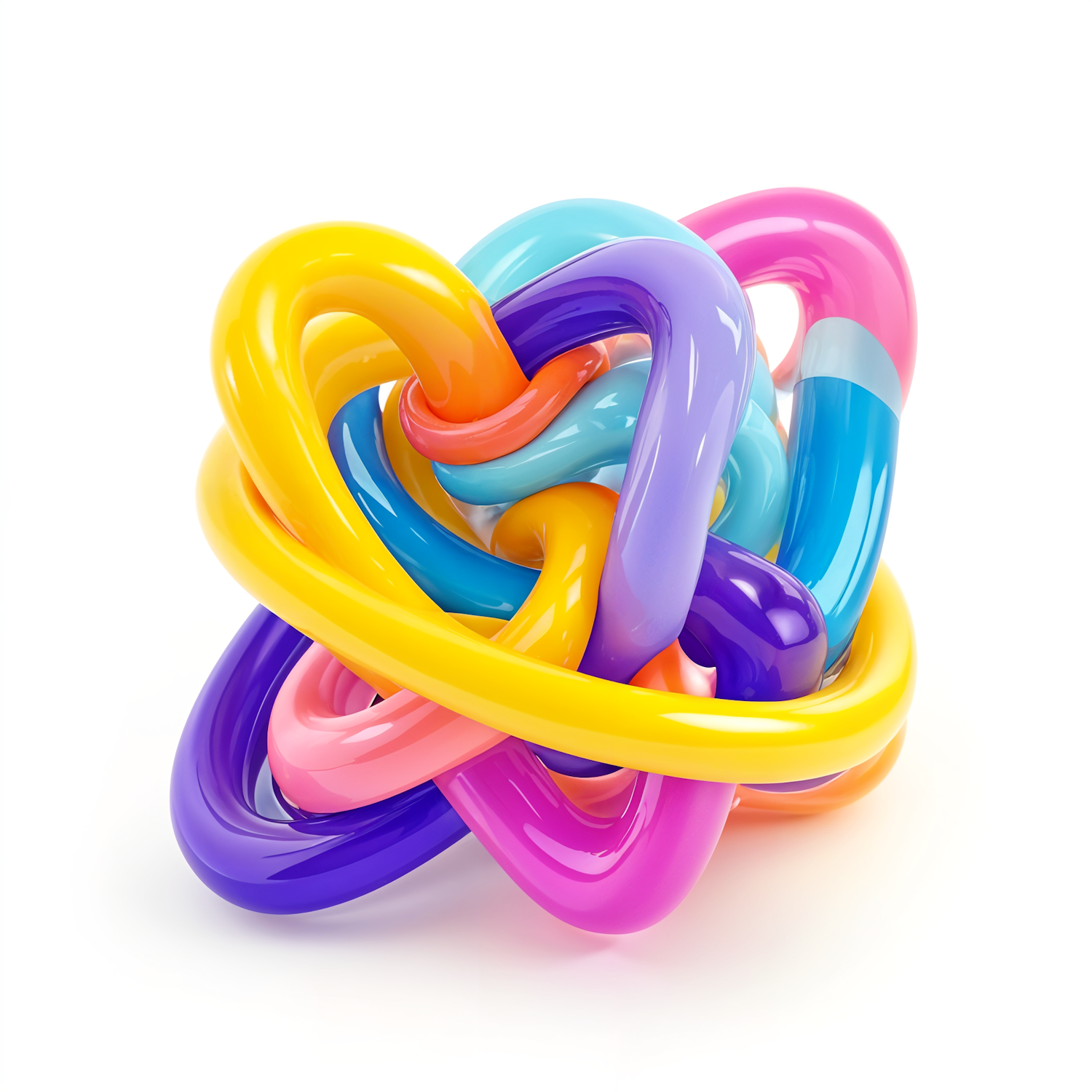 Bright, glossy tubes in yellow, purple, pink, and blue intertwine in a playful knot-like sculpture on a clean white background.