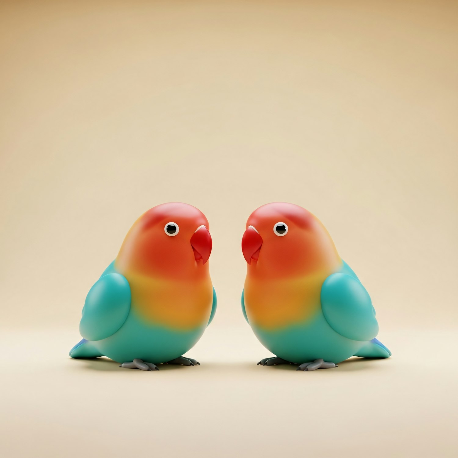 Two vibrant, stylized bird figurines with a glossy finish, featuring a gradient of red, orange, yellow, and green hues, facing each other.