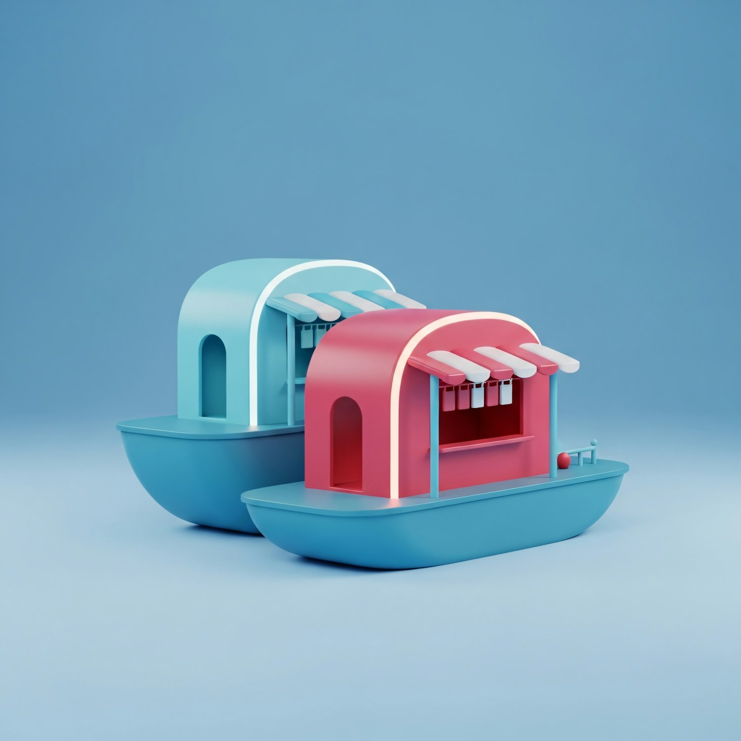 Two colorful, stylized boat structures with awnings and counters, set against a blue background, showcasing a playful and minimalistic design.