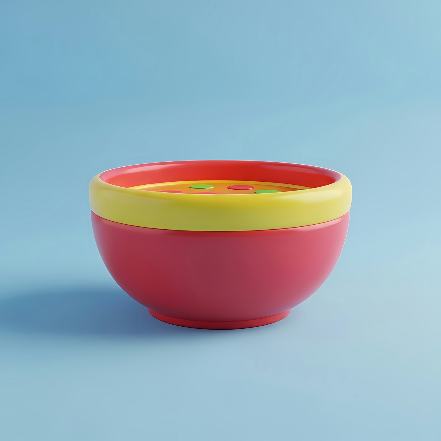 Bright red and yellow bowl with colorful contents on a light blue background, perfect for vibrant kitchen or food-related designs.