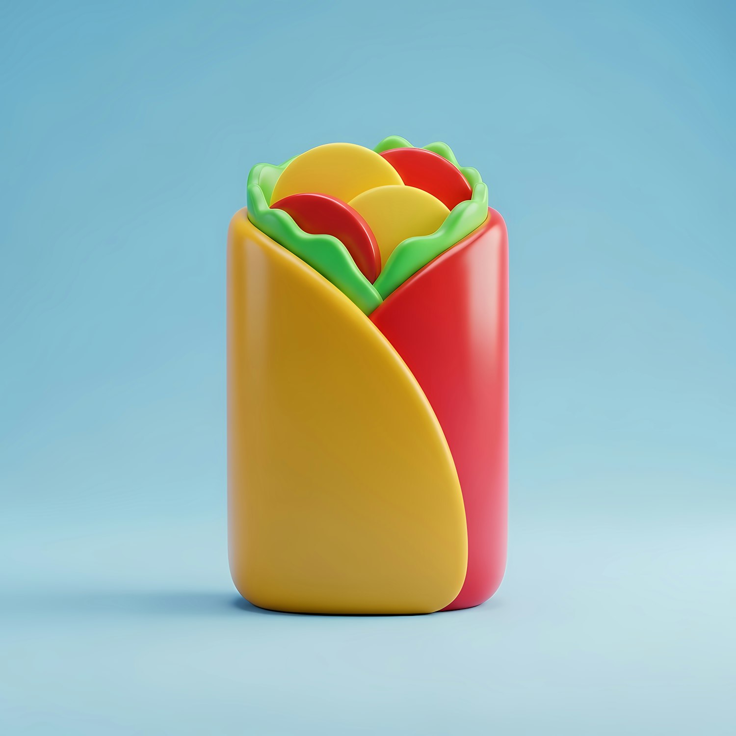Bright 3D illustration of a stylized burrito with vibrant colors and a playful design on a light blue background.