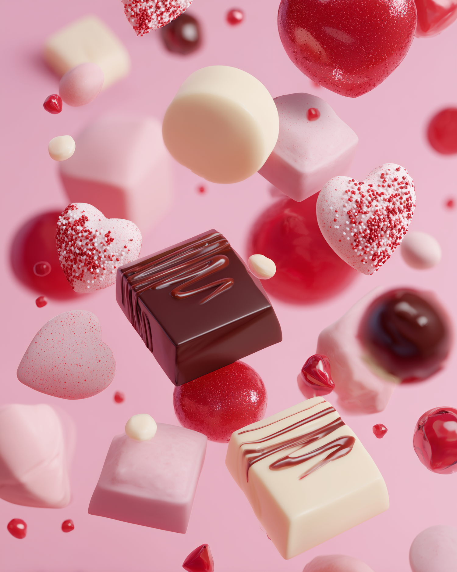 A delightful assortment of chocolates and candies in various shapes and colors, floating against a pink background, perfect for a festive treat.