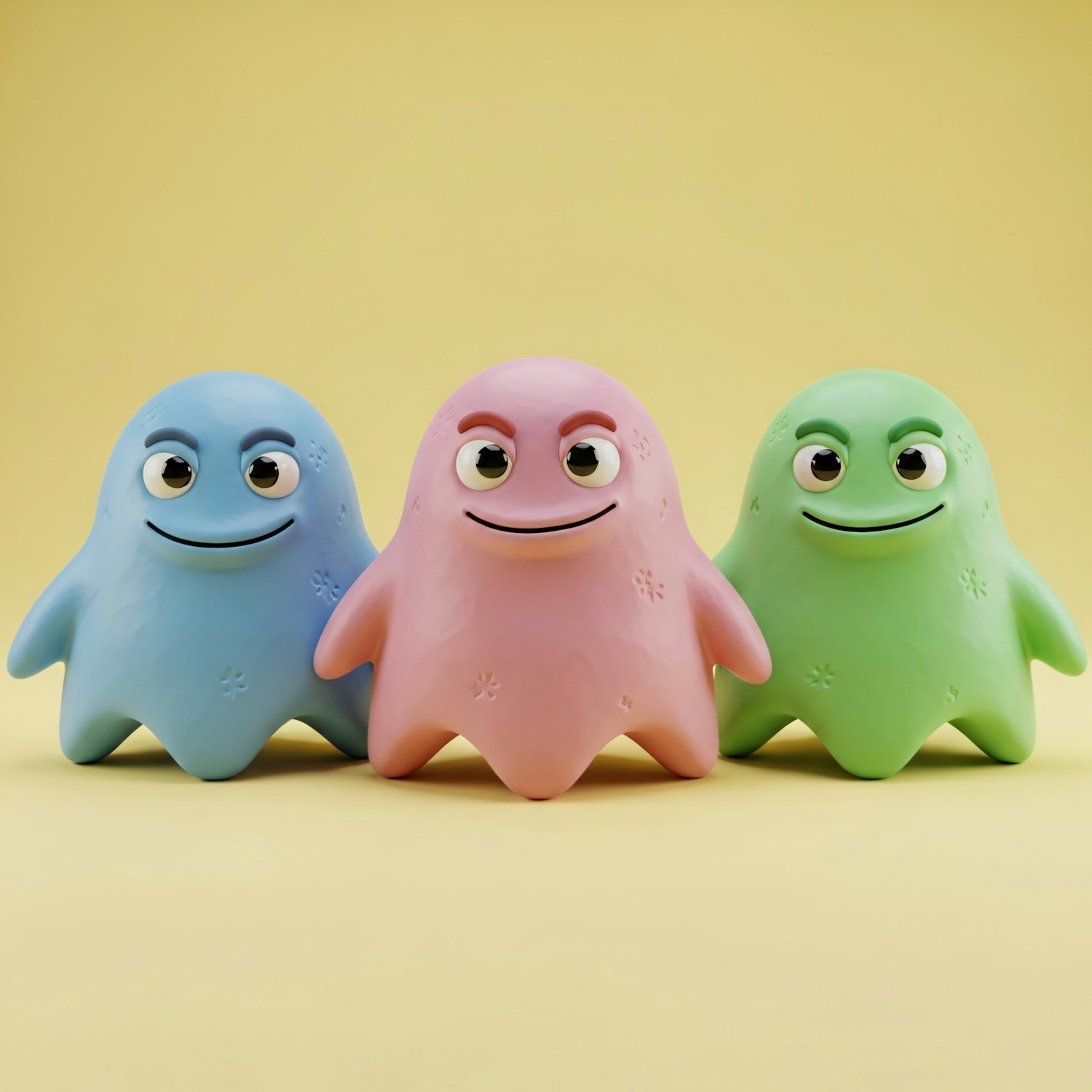 Three colorful, smiling cartoon characters in blue, pink, and green stand against a yellow background, radiating playful charm.
