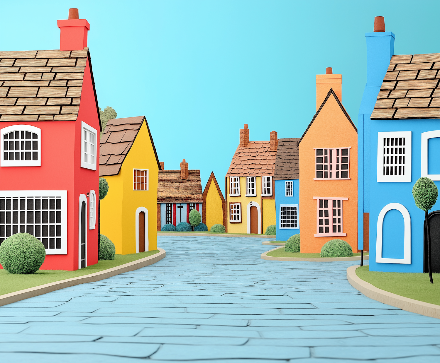 Charming cartoon street with colorful houses and cobblestone path under a clear blue sky. Whimsical and inviting neighborhood scene.