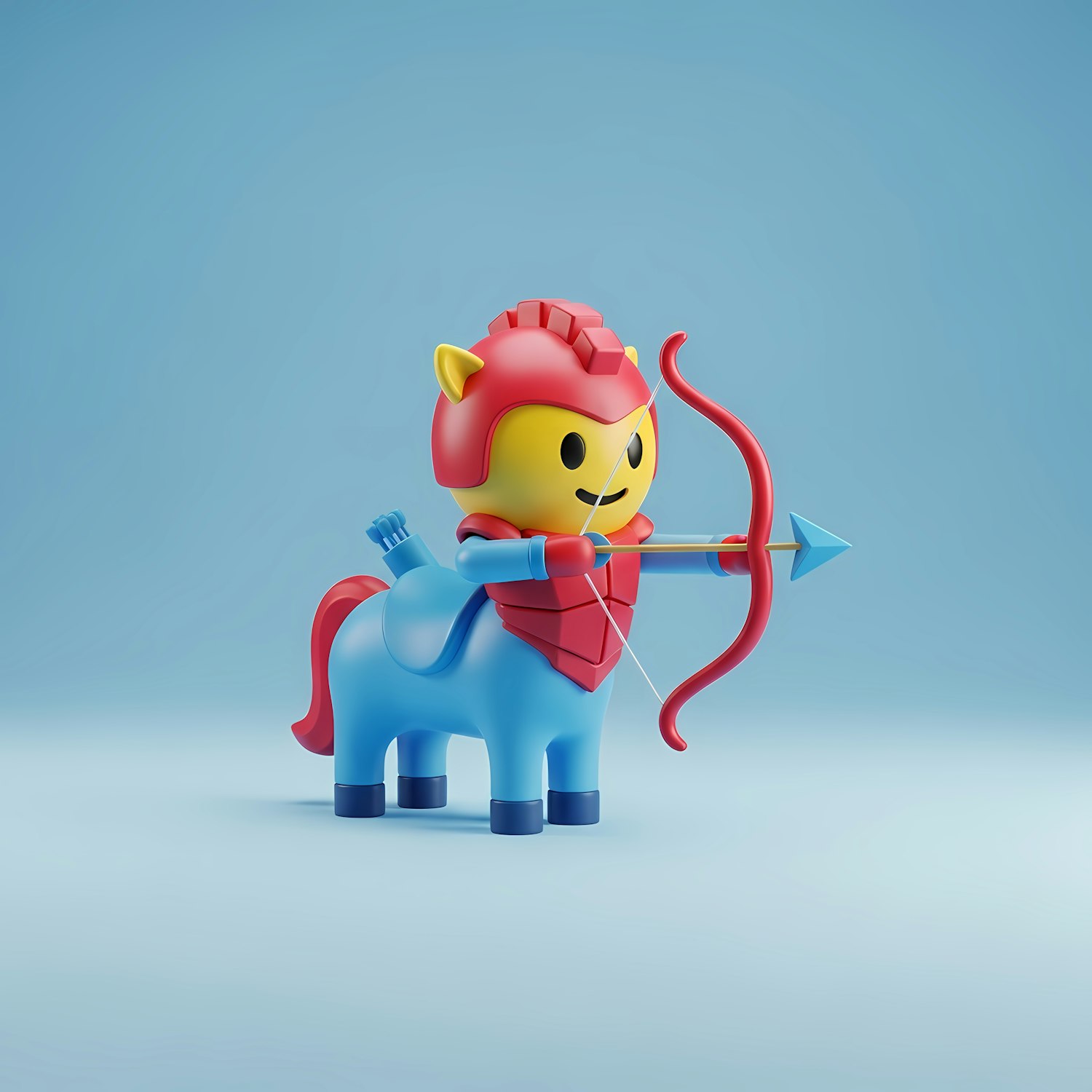 A vibrant 3D cartoon centaur character with a bow and arrow, set against a bright blue background. Perfect for playful designs.
