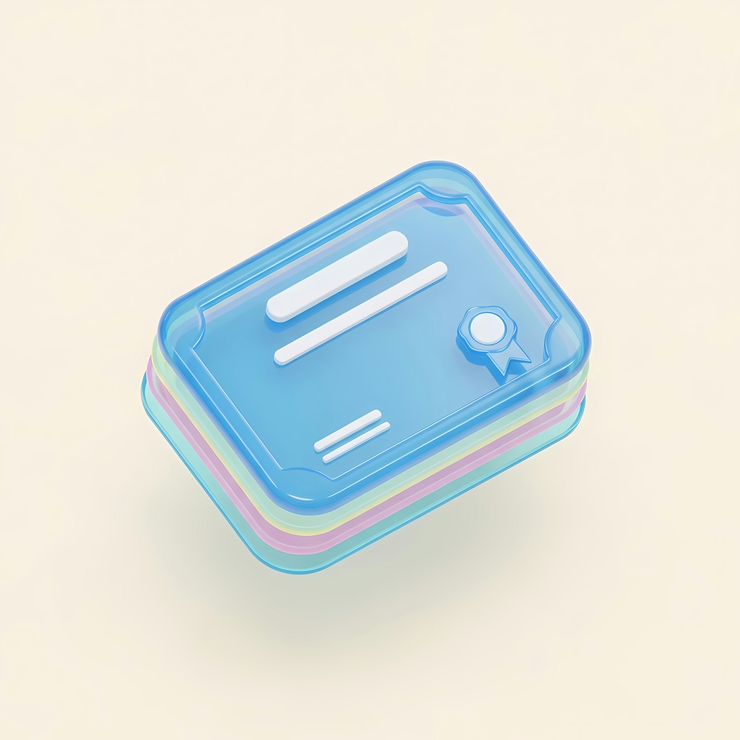 Stylized 3D illustration of a stack of colorful certificates with embossed details, set against a clean beige background.