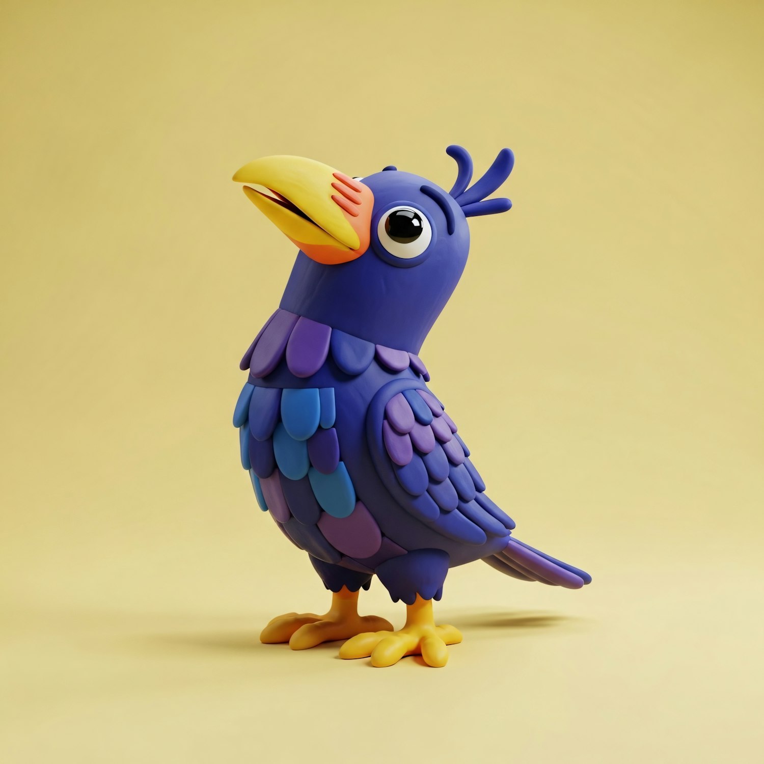 A colorful clay bird sculpture with purple feathers and a yellow beak, set against a yellow background, showcasing playful artistry.