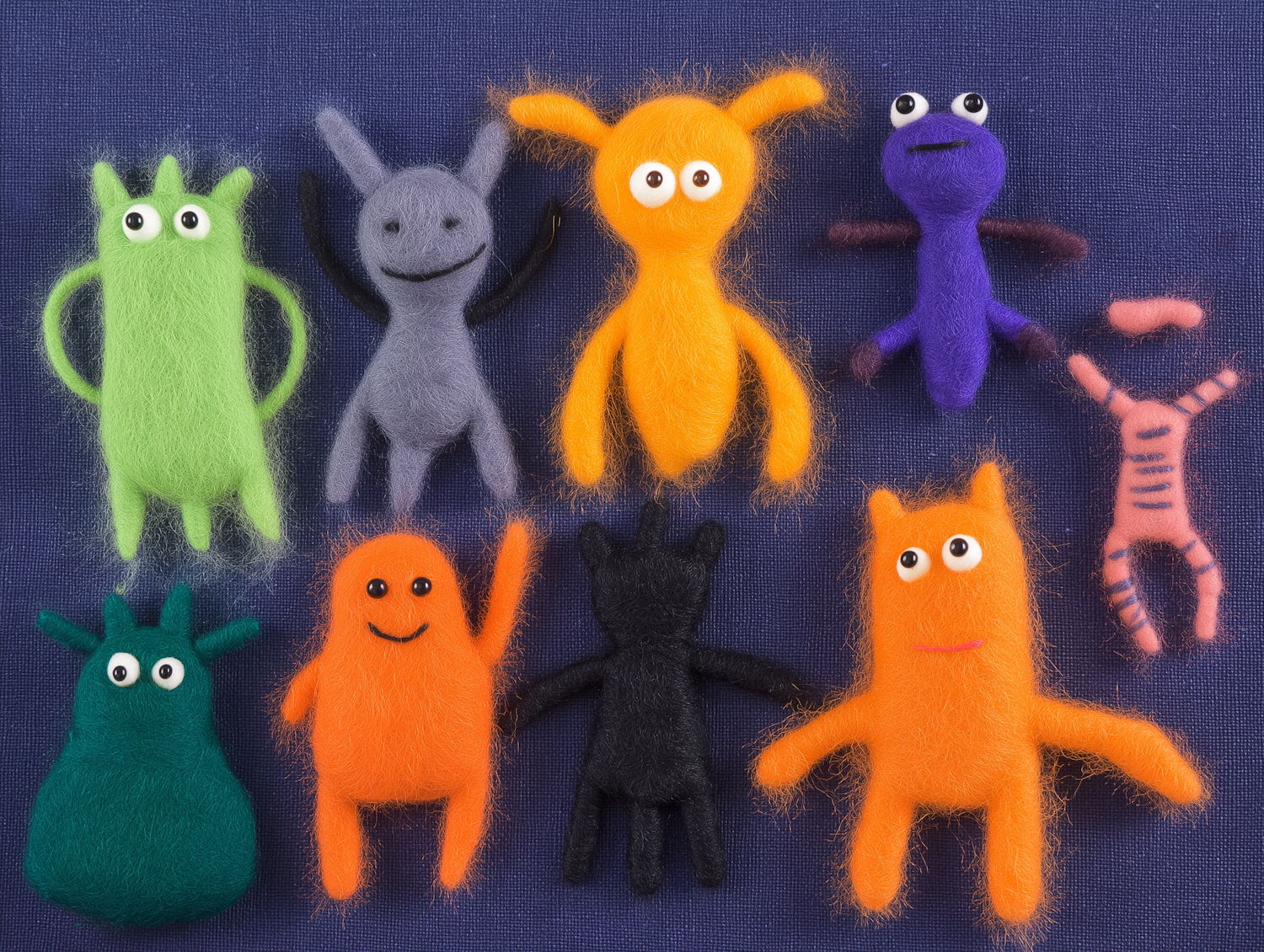 Colorful felt creatures with big eyes and fuzzy textures on a blue background, showcasing playful and whimsical designs.
