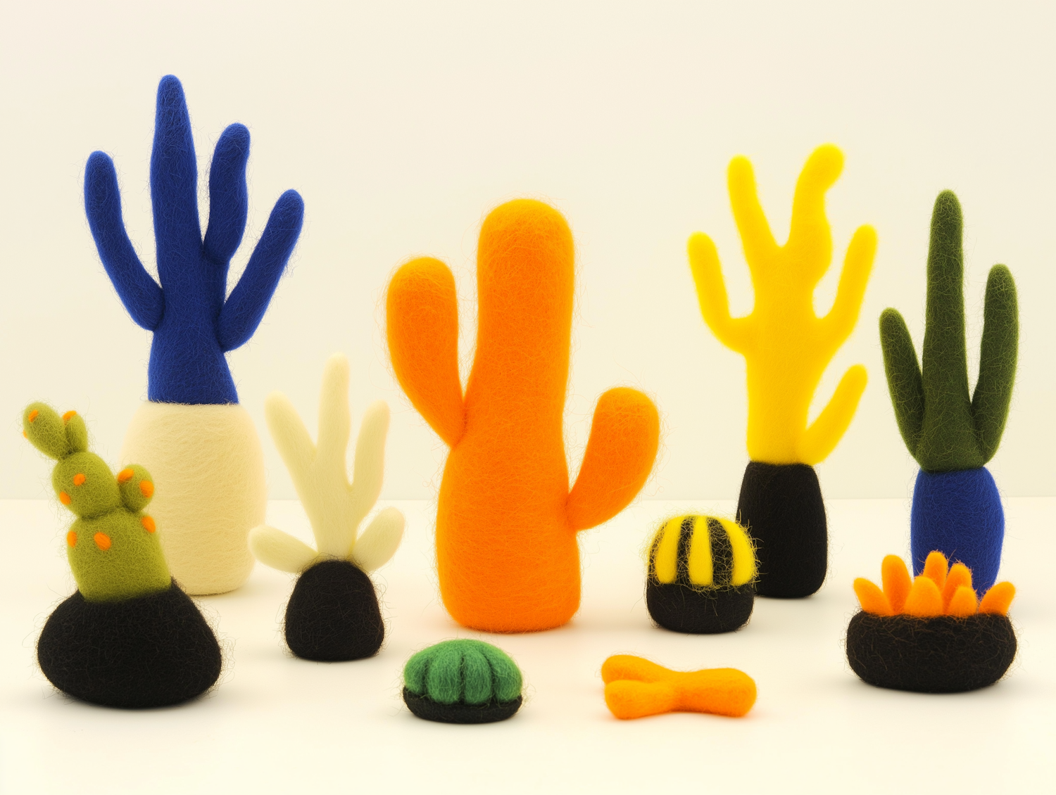 Vibrant felt cacti and succulents in various colors and shapes, artistically arranged on a plain surface.