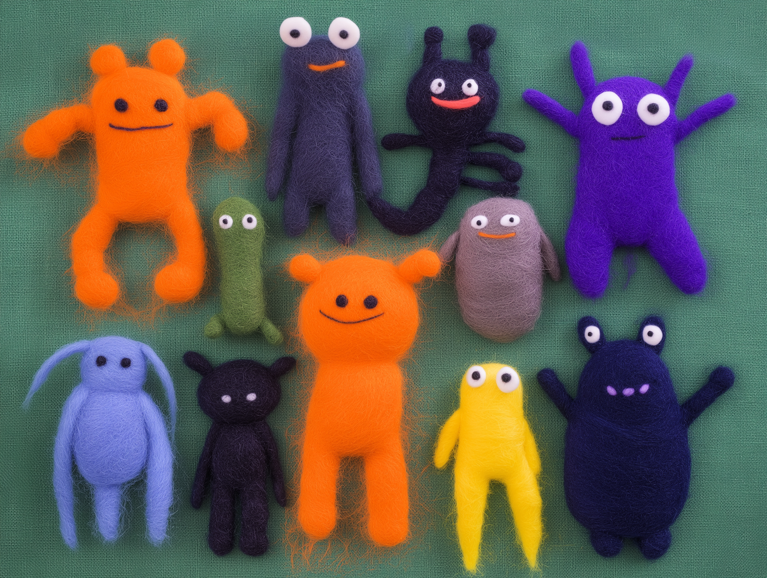 Colorful felted creatures with googly eyes on a green background, showcasing playful and whimsical designs.