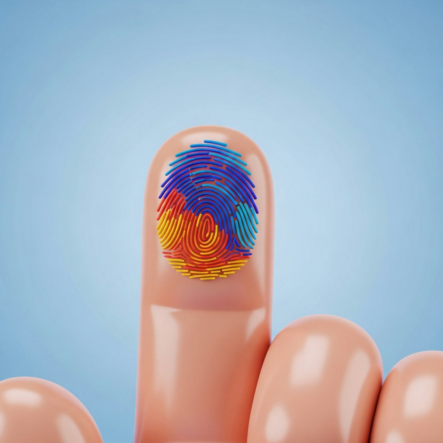 A vibrant 3D-rendered close-up of a finger with a colorful fingerprint pattern, set against a clean blue gradient background.