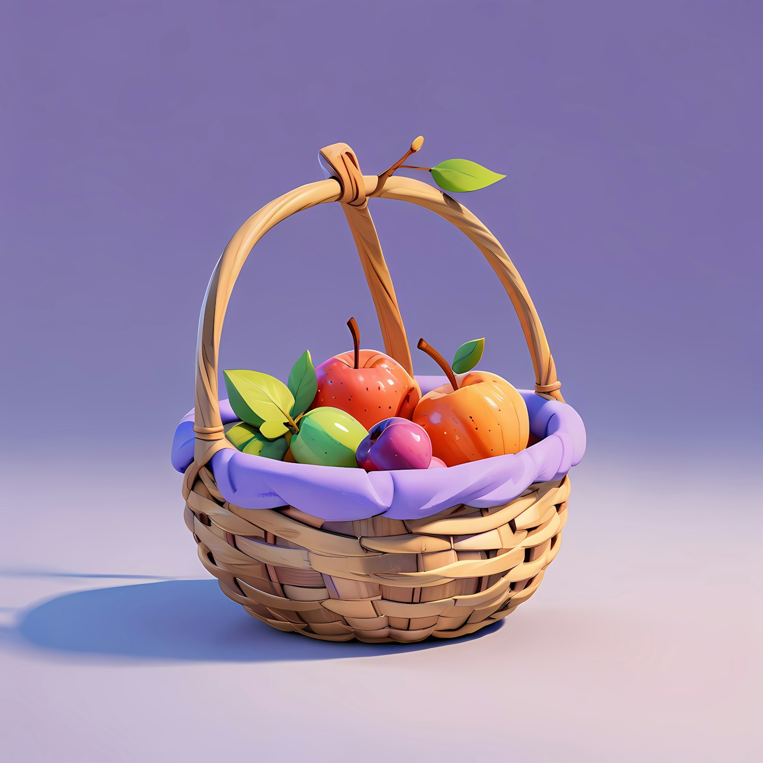 3D illustration of a wicker basket with colorful fruits and a purple cloth, set against a purple gradient background.