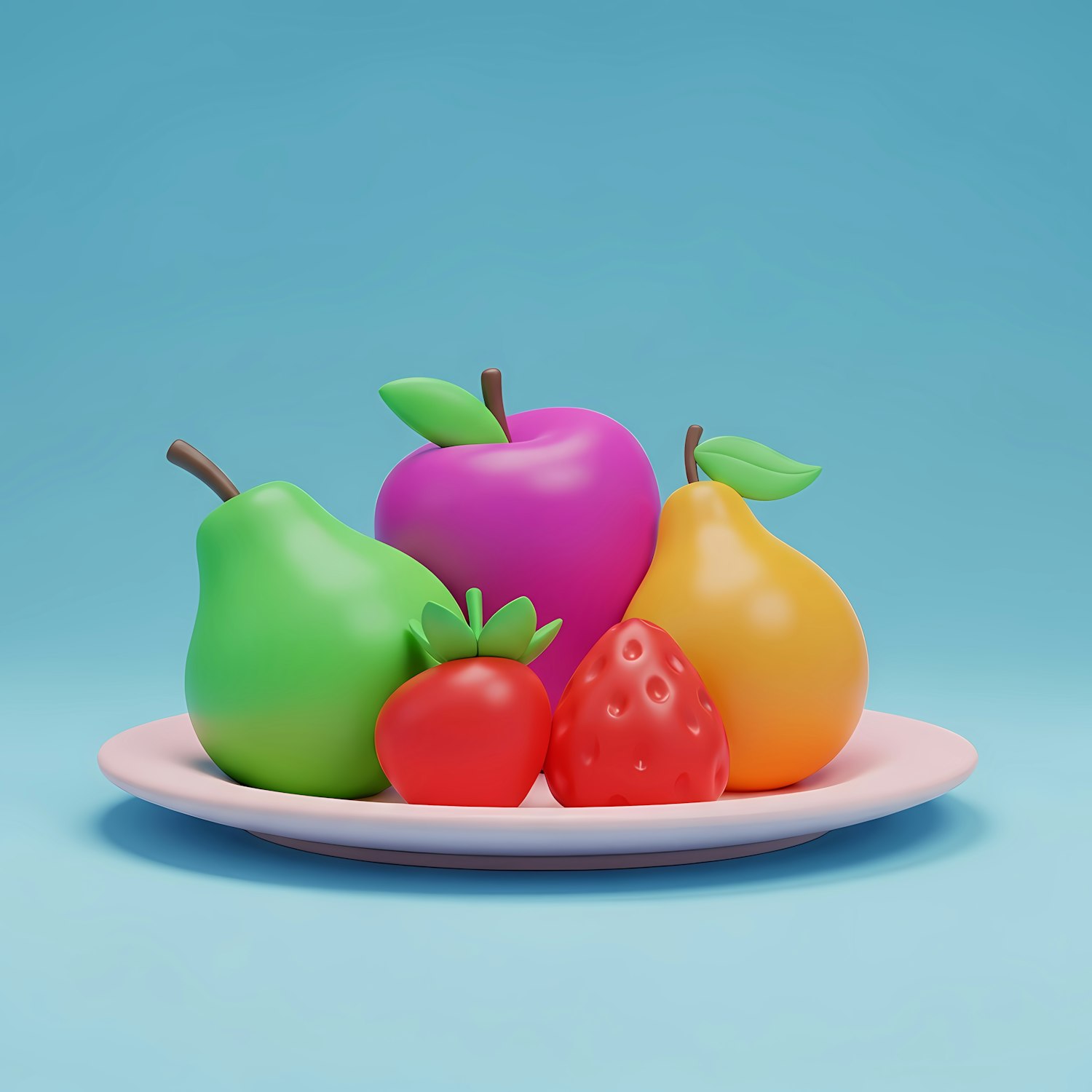 Vibrant 3D illustration of colorful fruits on a plate, including a pear, apple, and strawberries, set against a light blue background.