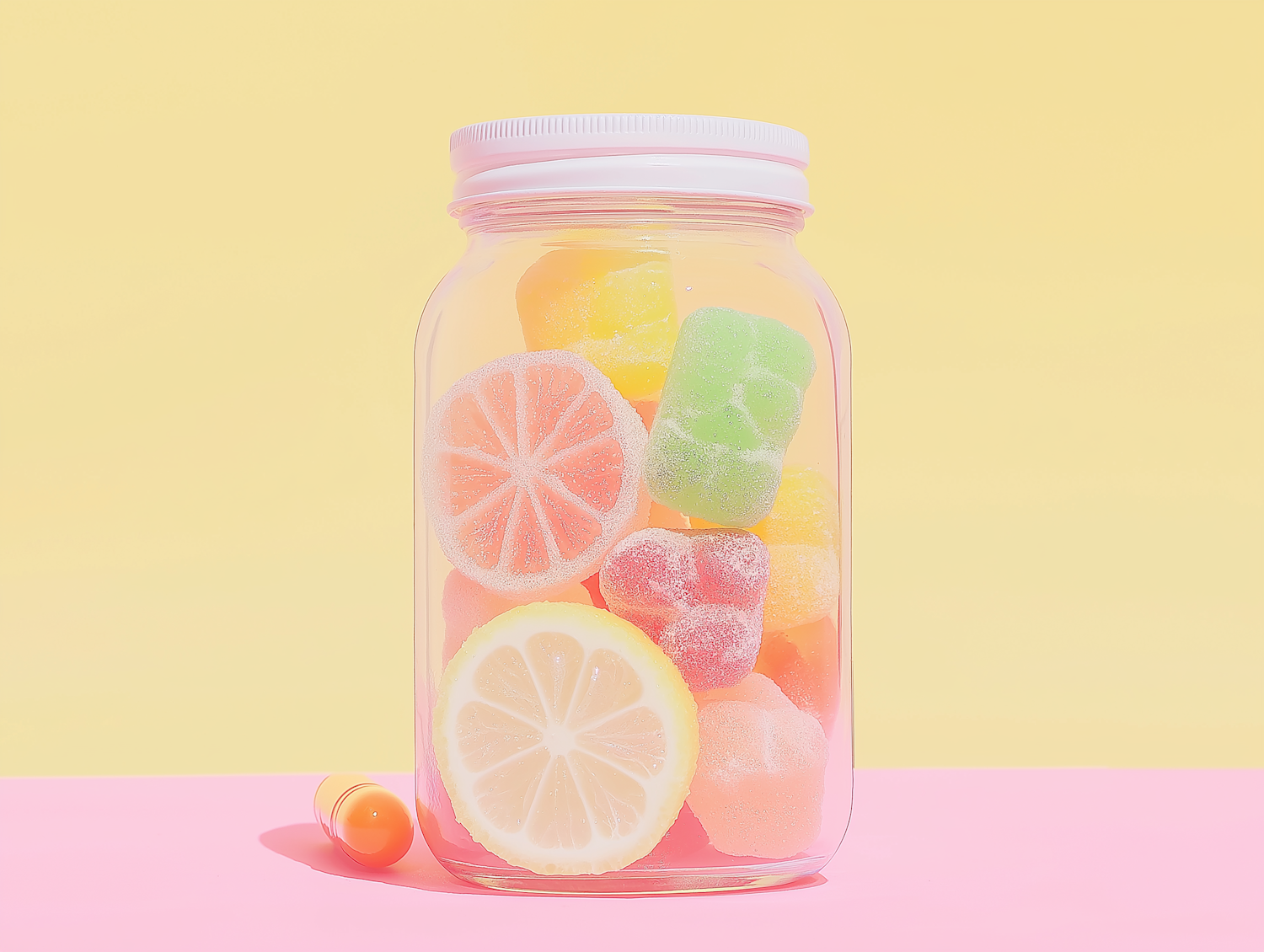 Vibrant jar of colorful gummy candies on a pastel background, featuring citrus shapes and a playful aesthetic.