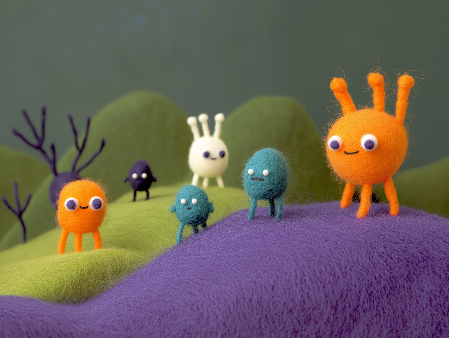 Colorful felt creatures on a whimsical landscape of green and purple hills, featuring playful designs and vibrant textures.