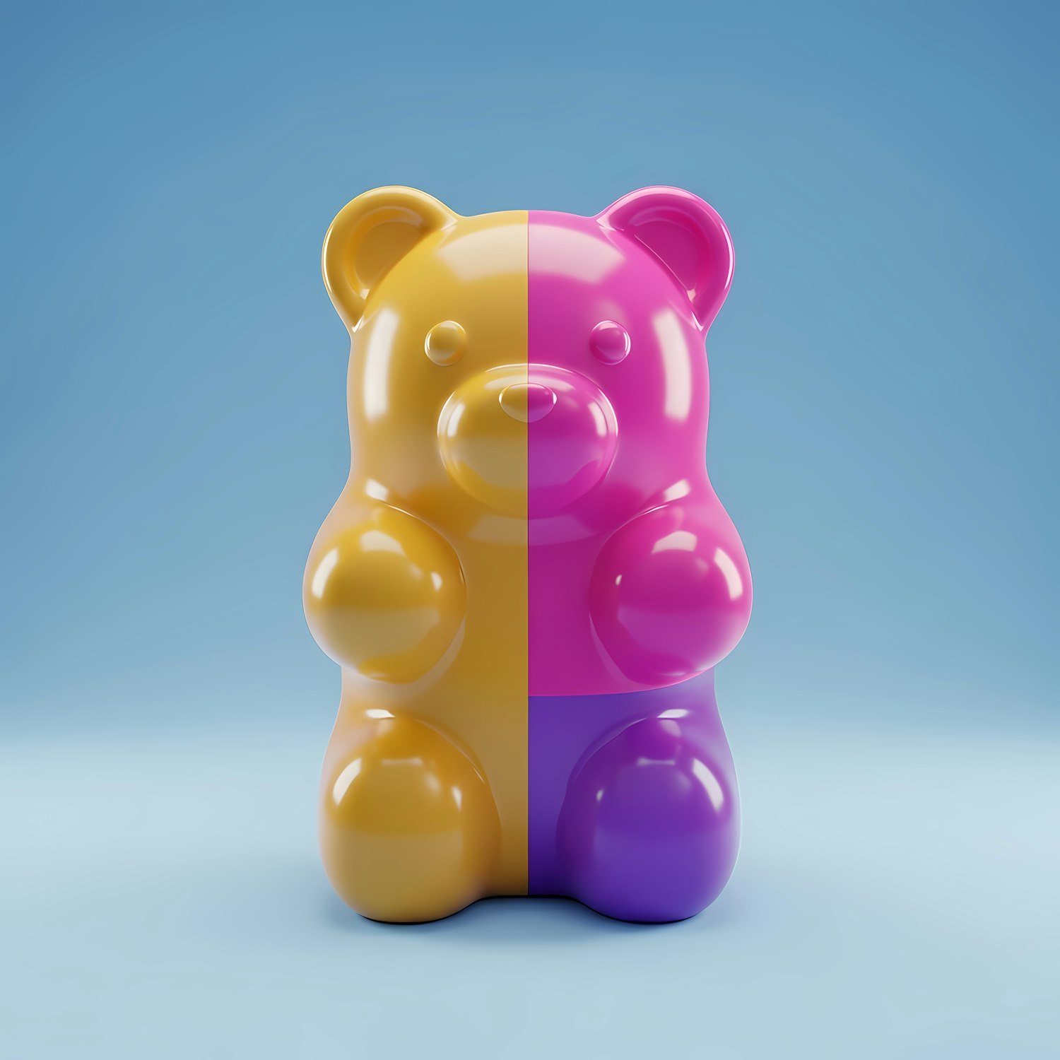 A vibrant gummy bear figurine split into yellow and pink-purple halves, set against a clean blue background. Fun and colorful design!