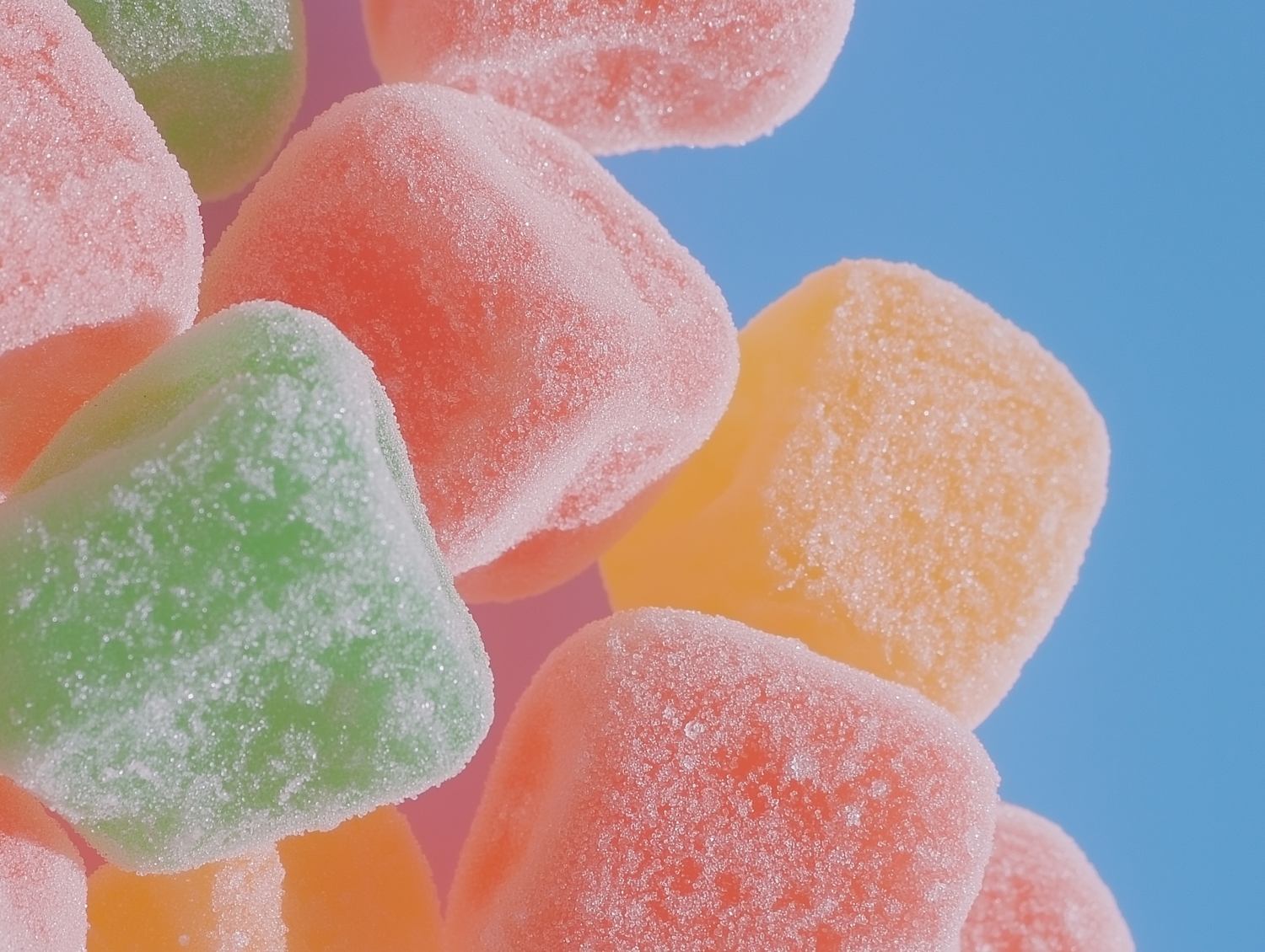 Close-up of colorful sugar-coated gummy candies in pink, green, and yellow against a blue background.