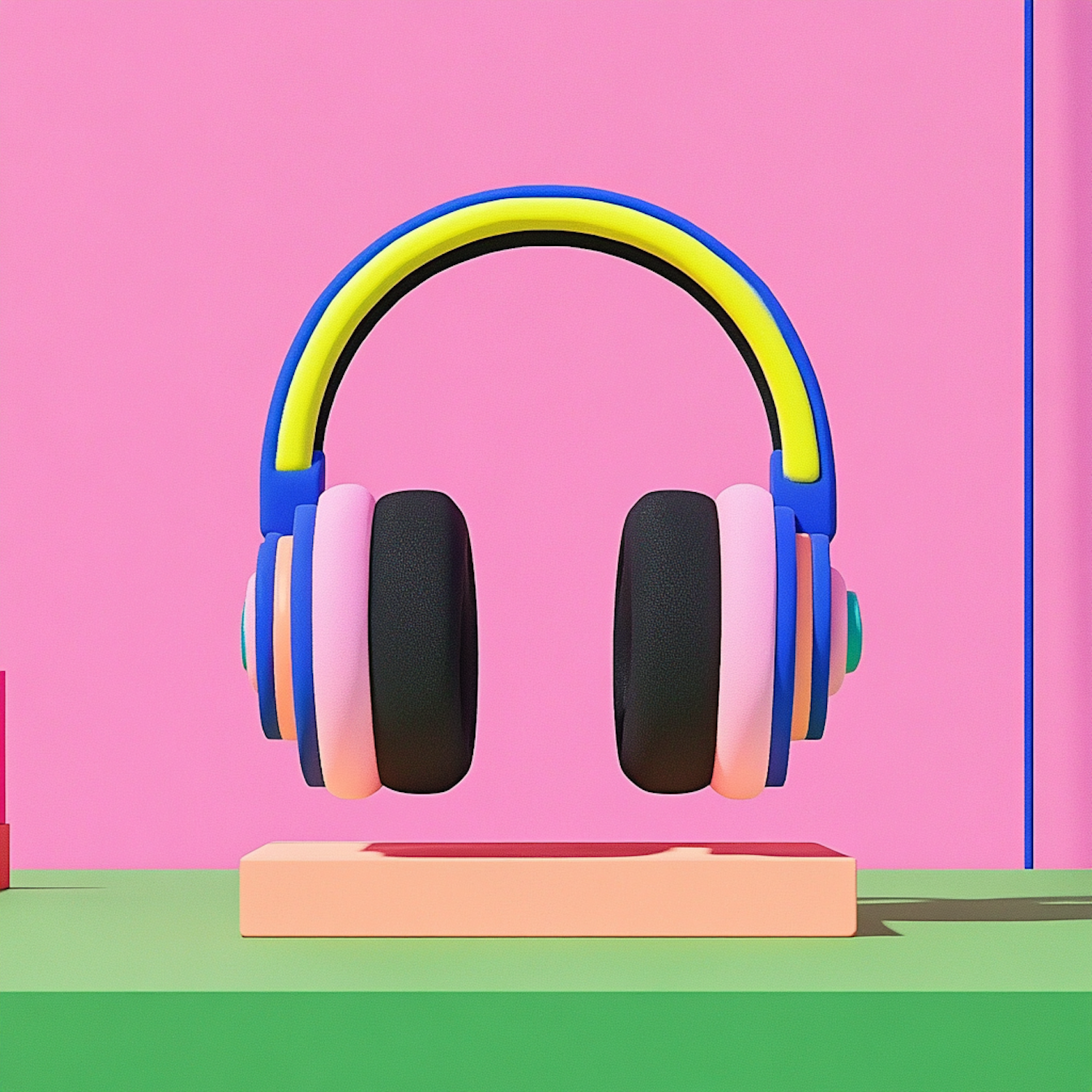 Bright and colorful over-ear headphones with a playful design in blue, yellow, pink, and black, set against a vibrant pink background.