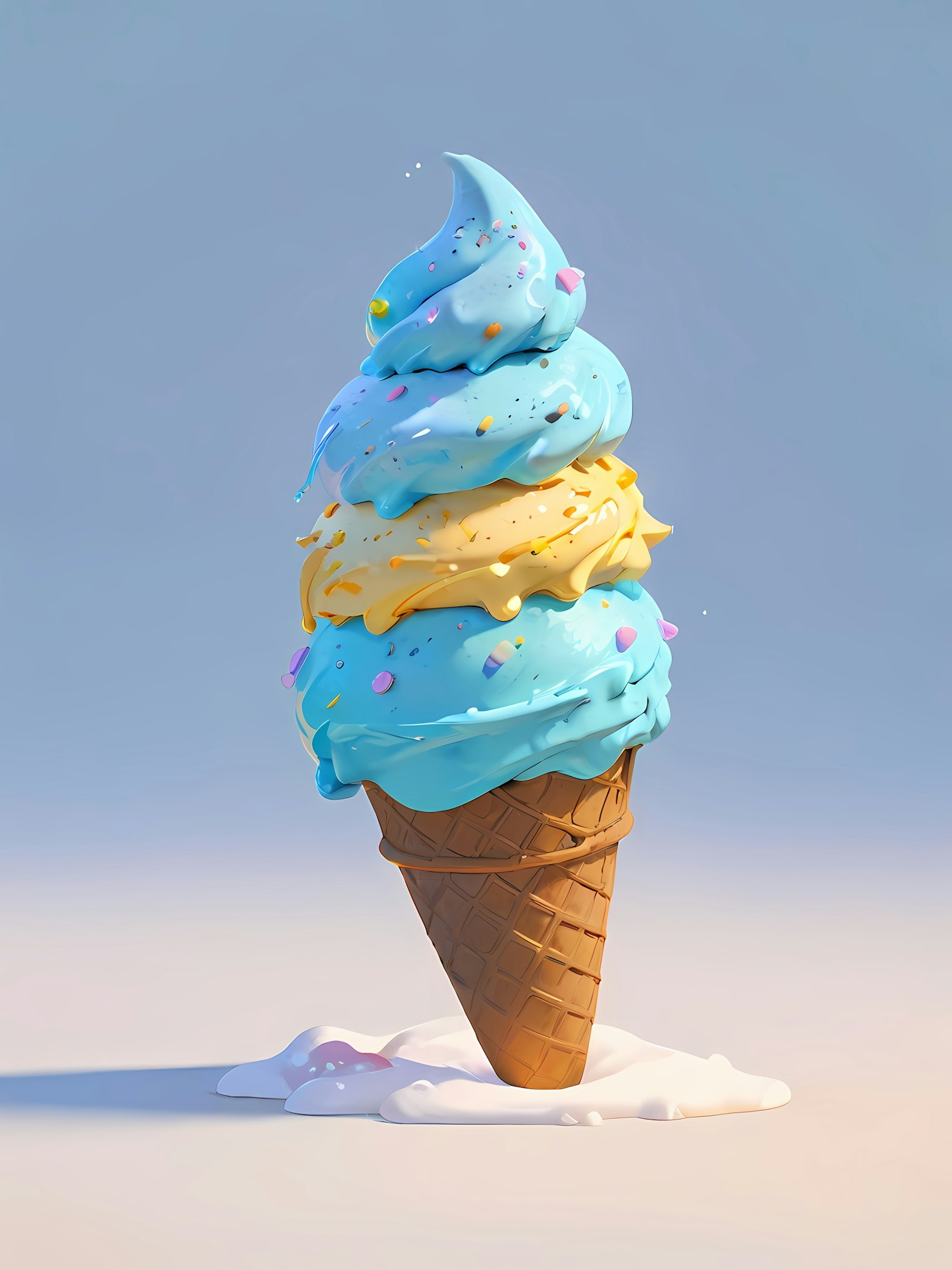 A vibrant 3D ice cream cone with blue and yellow scoops, sprinkles, and a waffle cone, set against a soft blue gradient background.