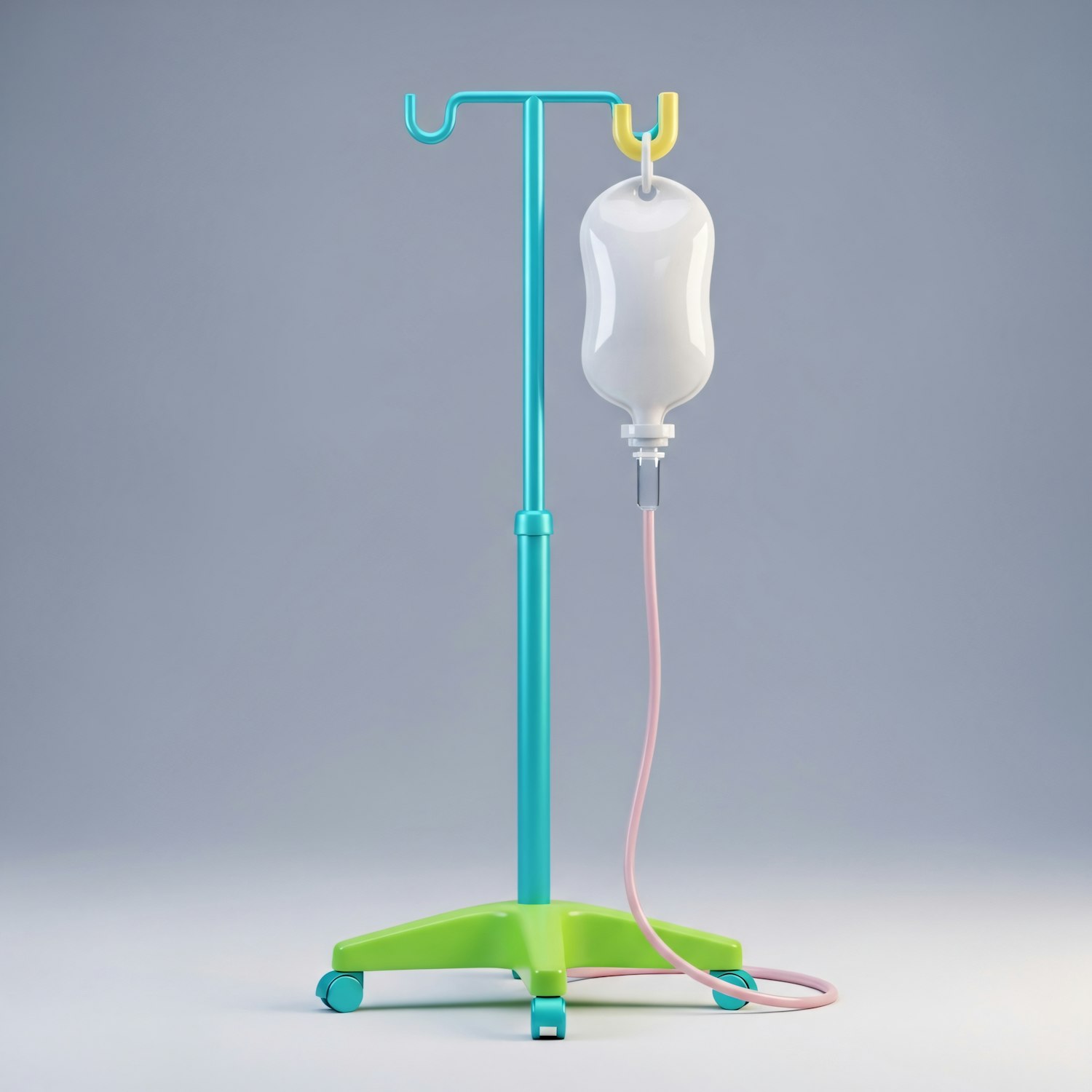 A vibrant IV stand with a turquoise pole, lime green base, and a white IV bag connected to a pink tube, set against a gray background.