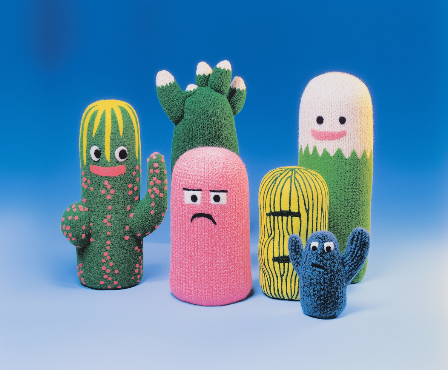 Colorful knitted plush toys with unique expressions against a bright blue background, creating a playful and whimsical scene.
