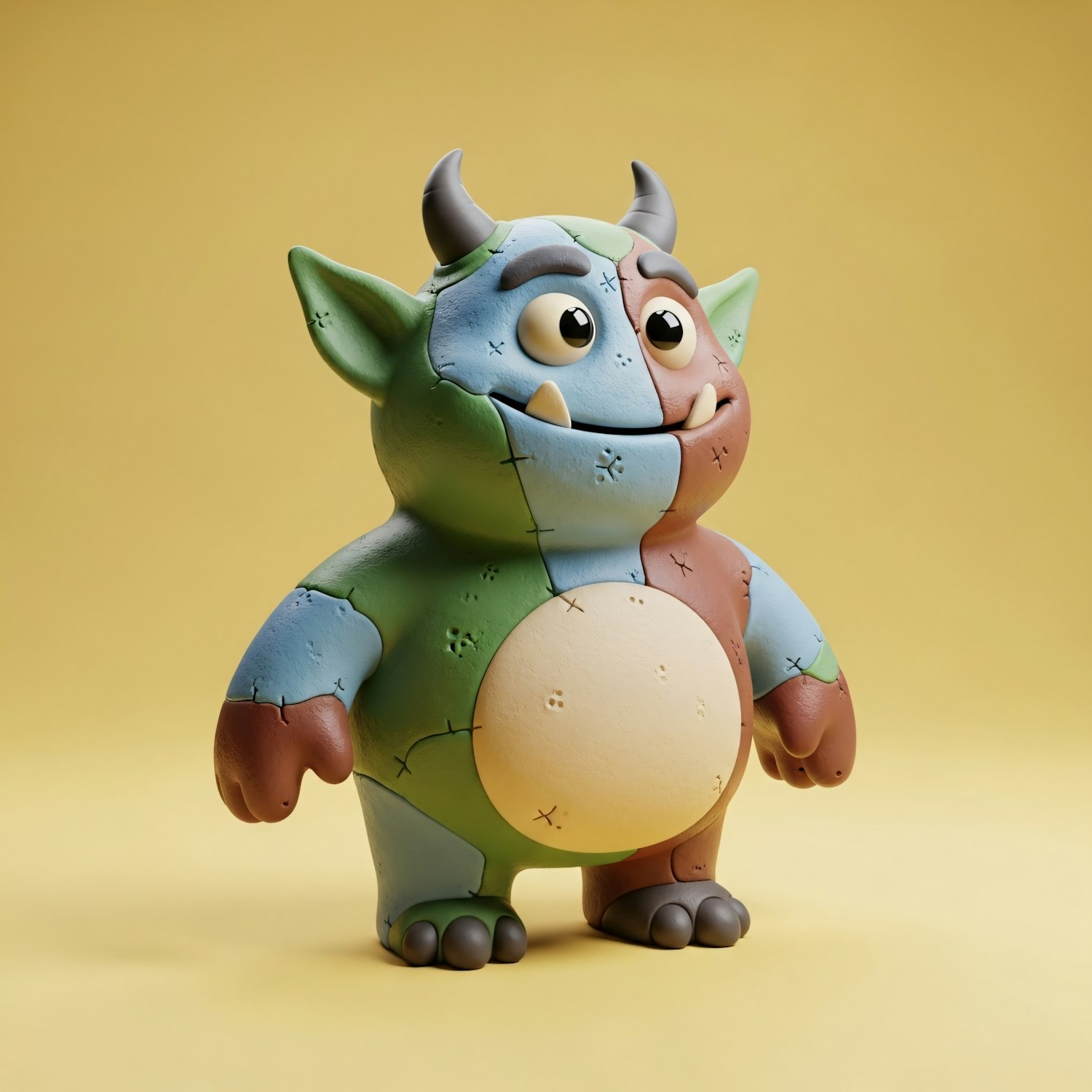 A colorful patchwork monster figurine with horns and tusks, set against a yellow background, exuding a playful and whimsical vibe.
