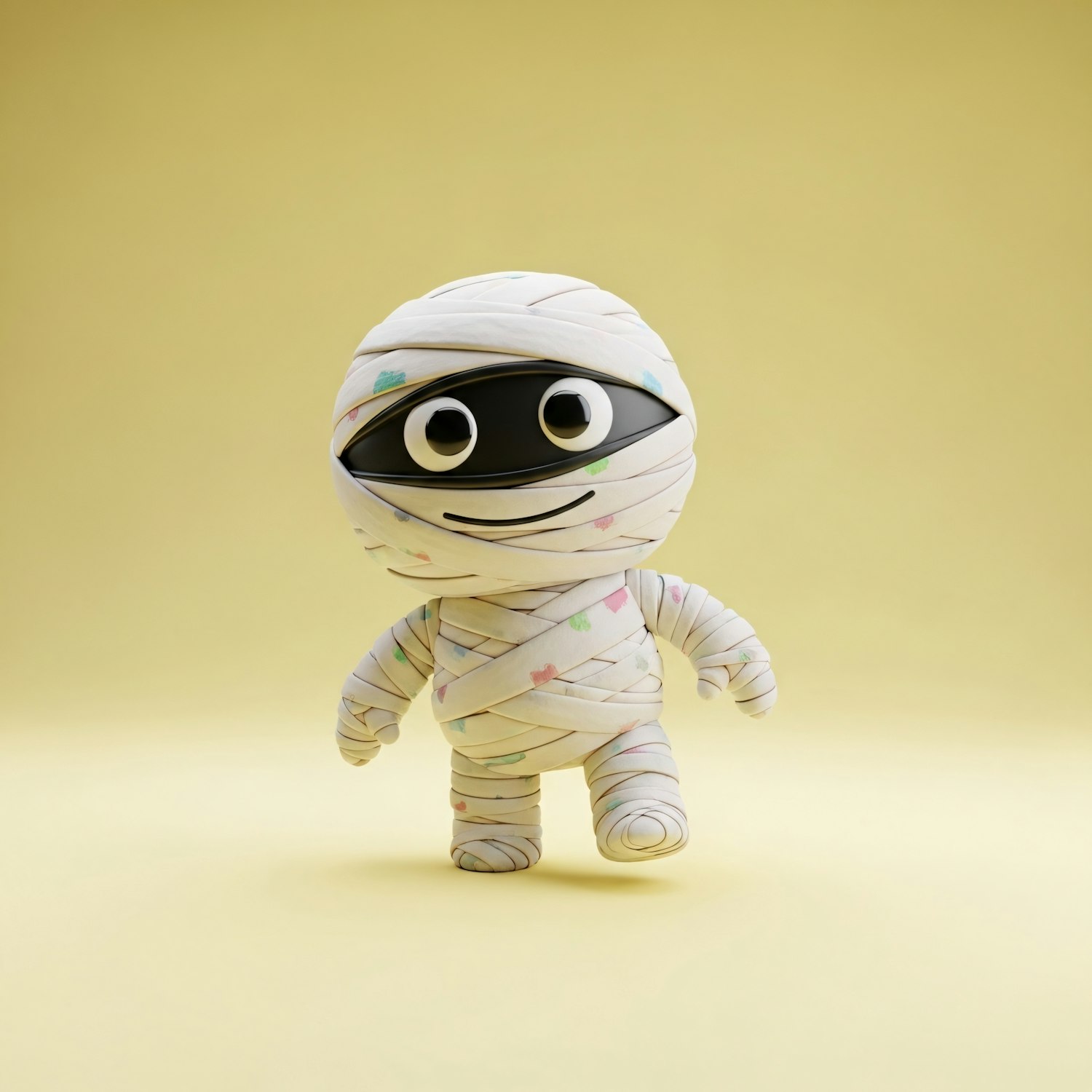 A cute cartoon mummy character with colorful bandages and a cheerful expression, set against a soft yellow background.