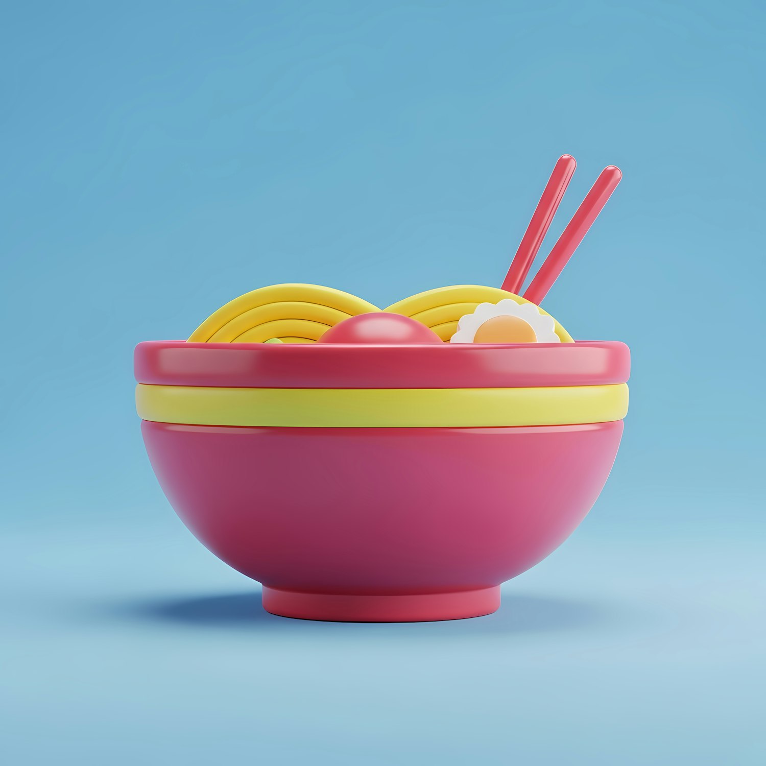 Bright 3D illustration of a noodle bowl with pink and yellow tones, featuring noodles, an egg, and chopsticks on a blue background.