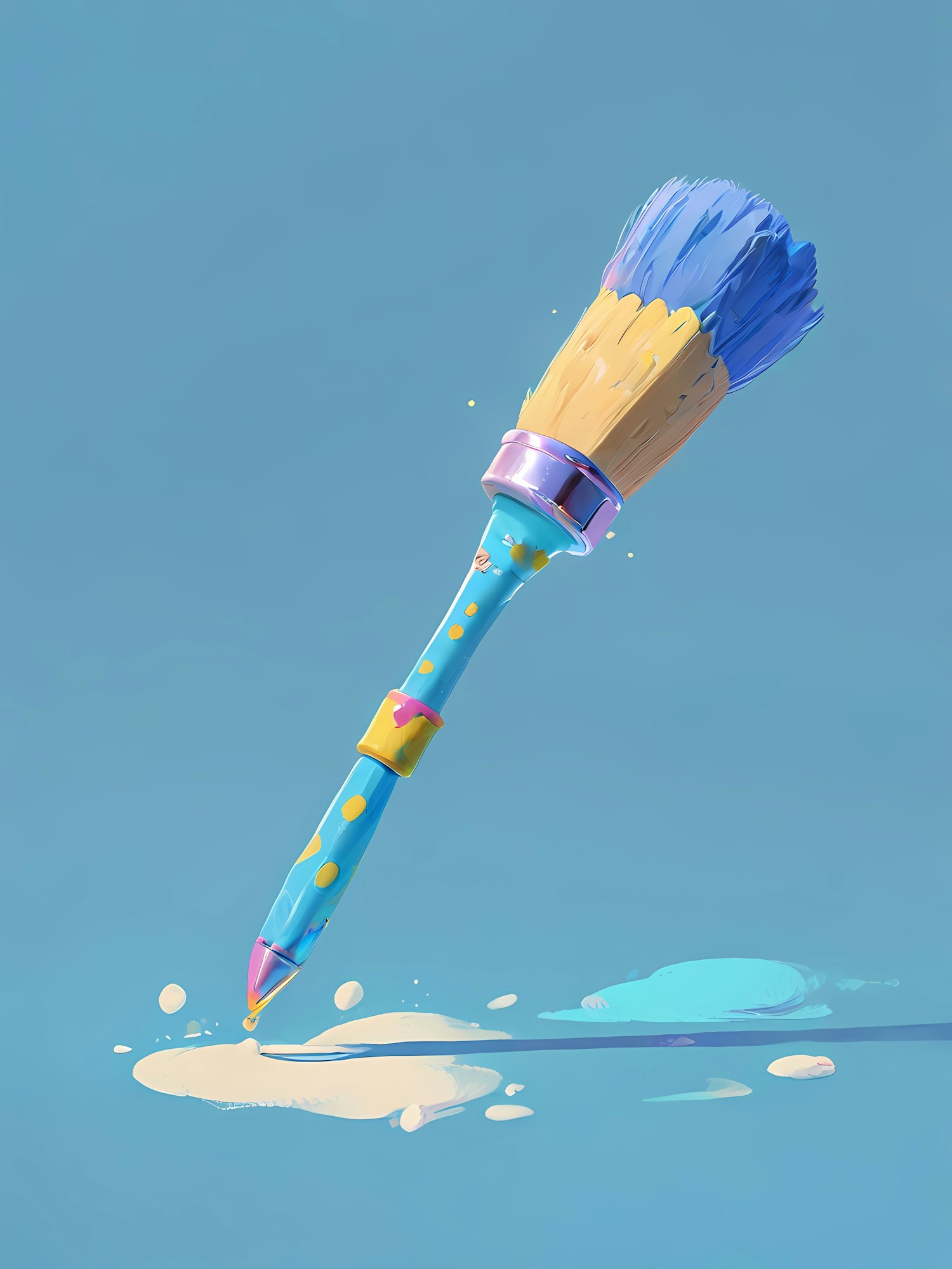 A vibrant illustration of a colorful paintbrush painting a creamy white stroke on a blue background, with playful splatters.