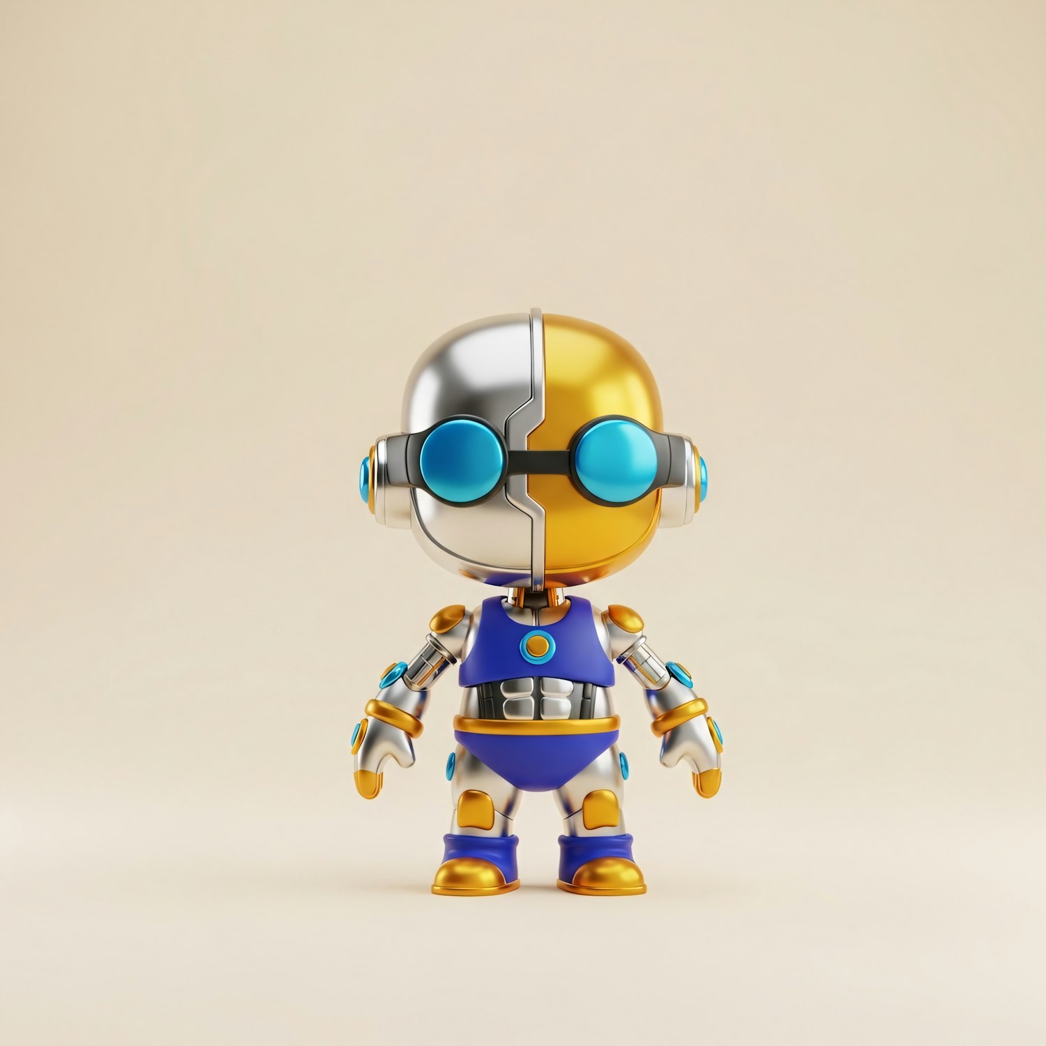 A colorful robot with a split silver and gold head, blue goggles, and a futuristic design stands against a neutral background.