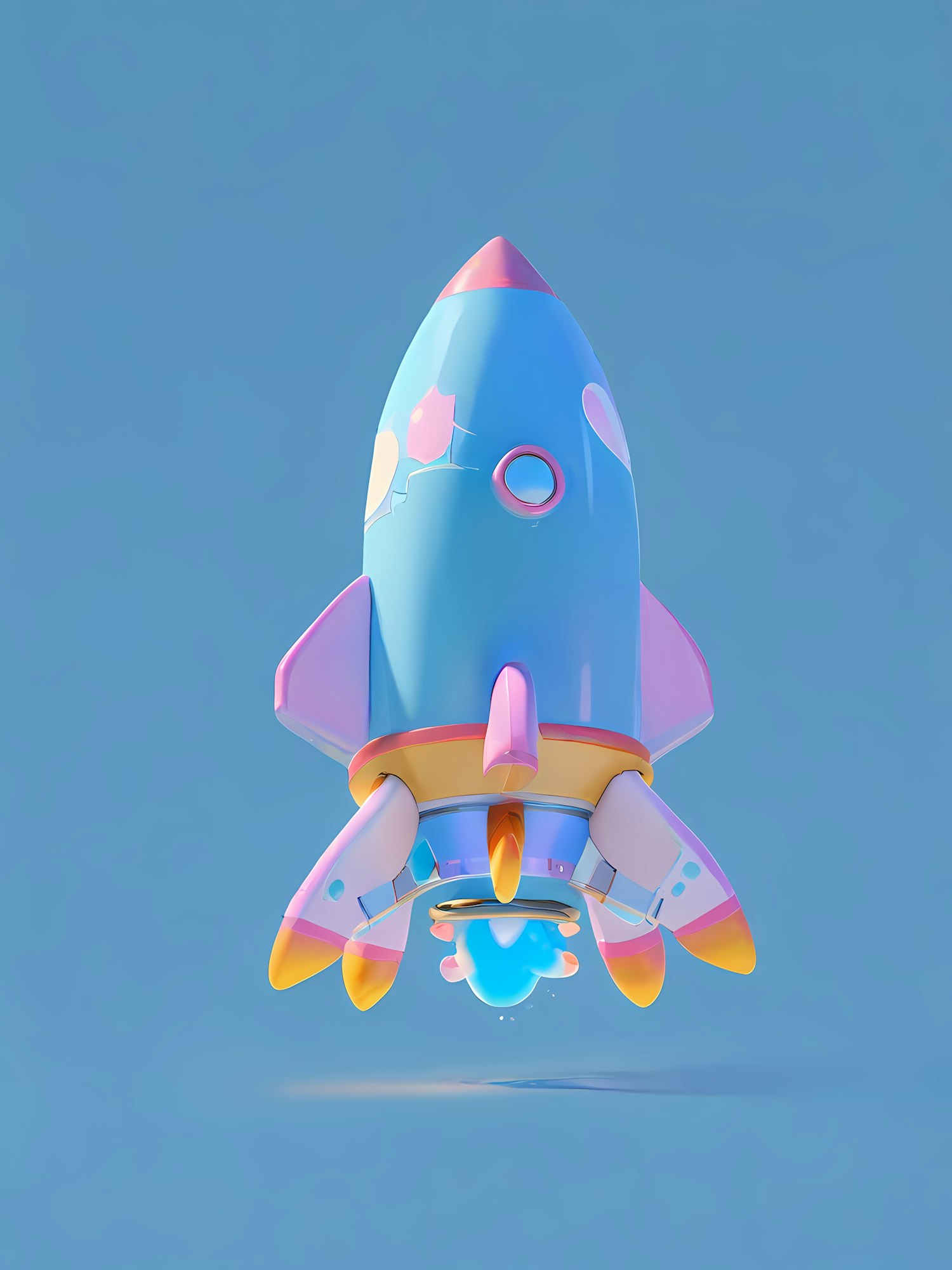 Vibrant 3D rocket illustration with pastel colors, mid-launch against a blue background. Perfect for playful, imaginative designs.