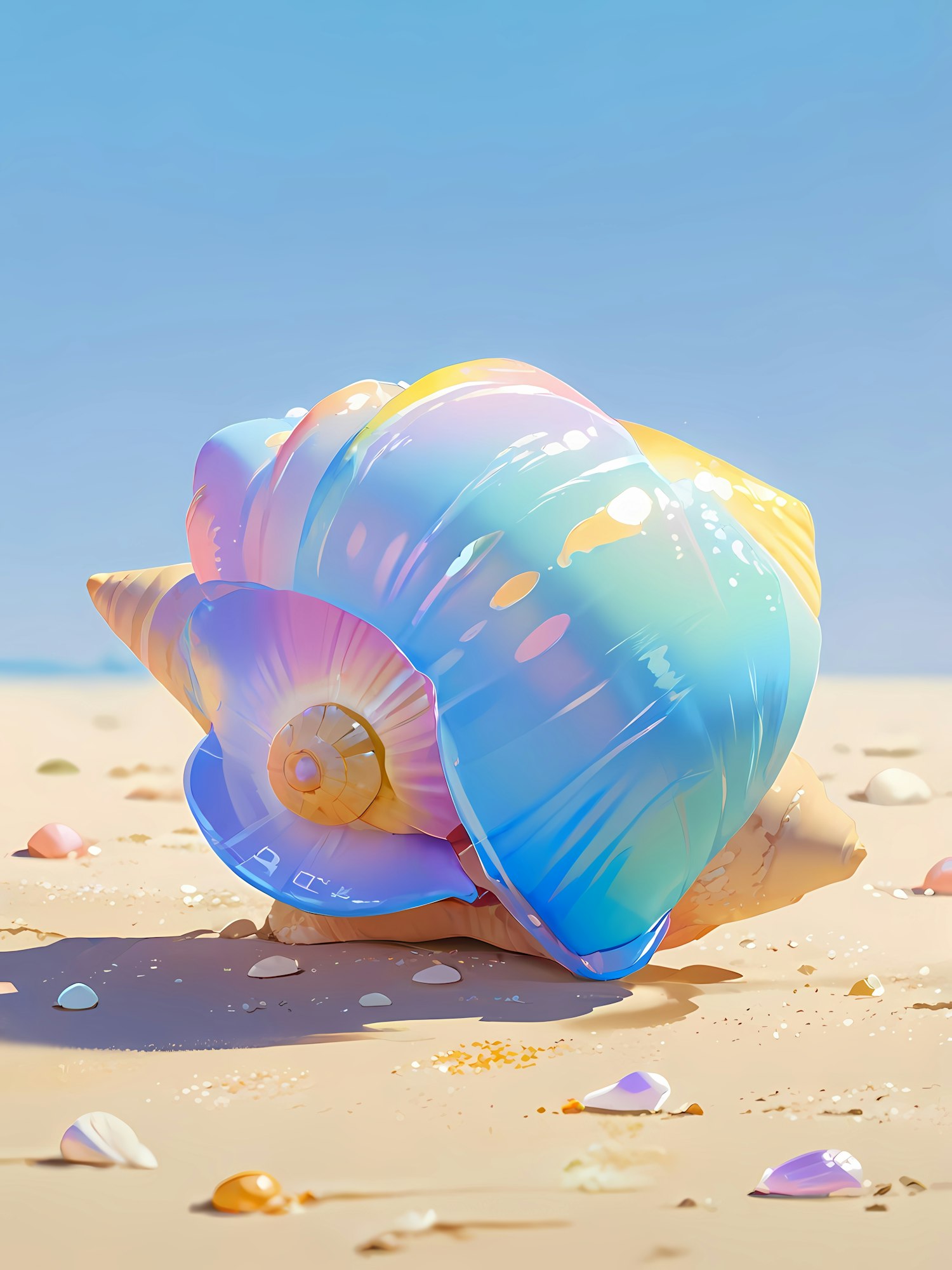 A pastel-colored seashell with iridescent hues on a sandy beach, surrounded by small shells under a clear blue sky.