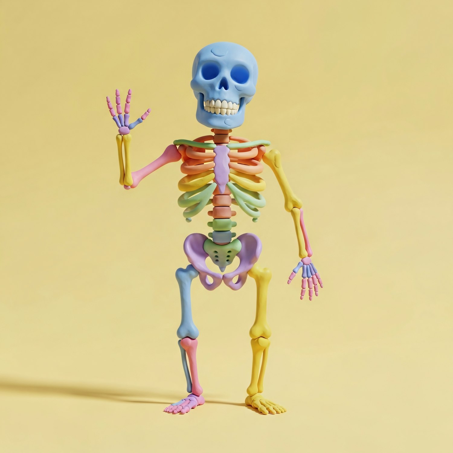 A vibrant, multicolored skeleton model waving against a yellow background, showcasing a playful and artistic design.