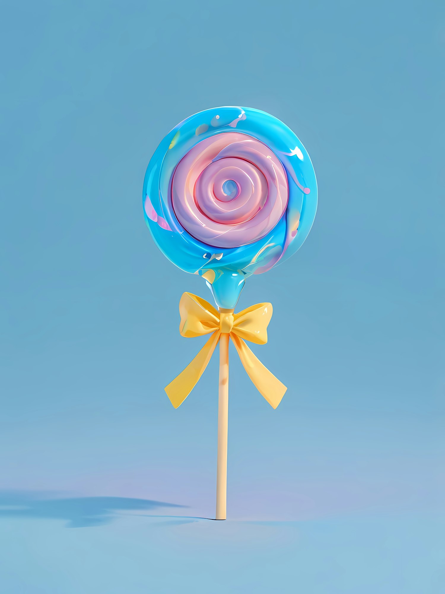 Bright pastel lollipop with pink and blue swirls, a yellow bow, and a clean blue background. Perfect for candy-themed designs.