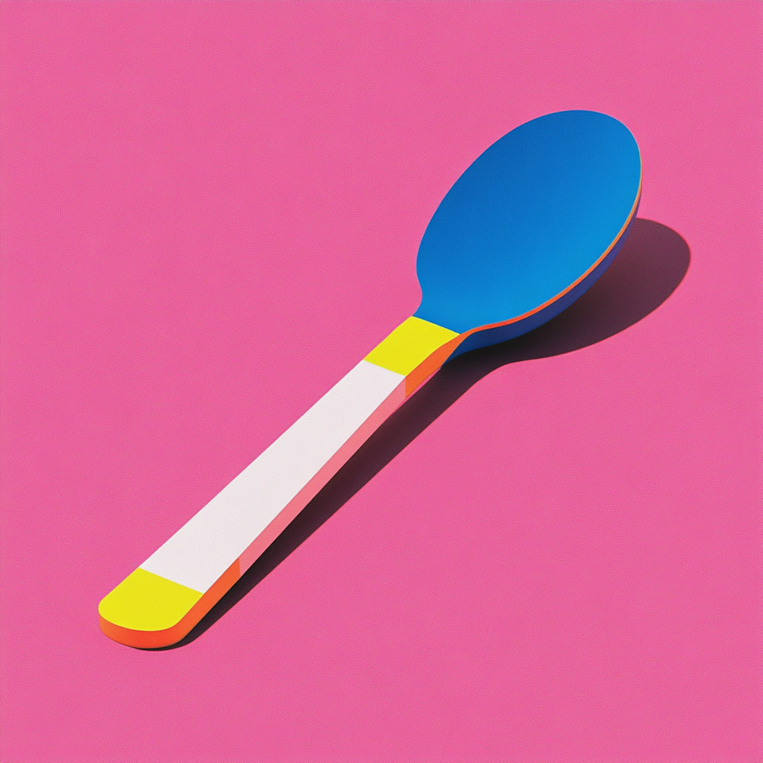 A colorful spoon with a blue bowl and geometric handle on a bright pink background, creating a bold and modern aesthetic.