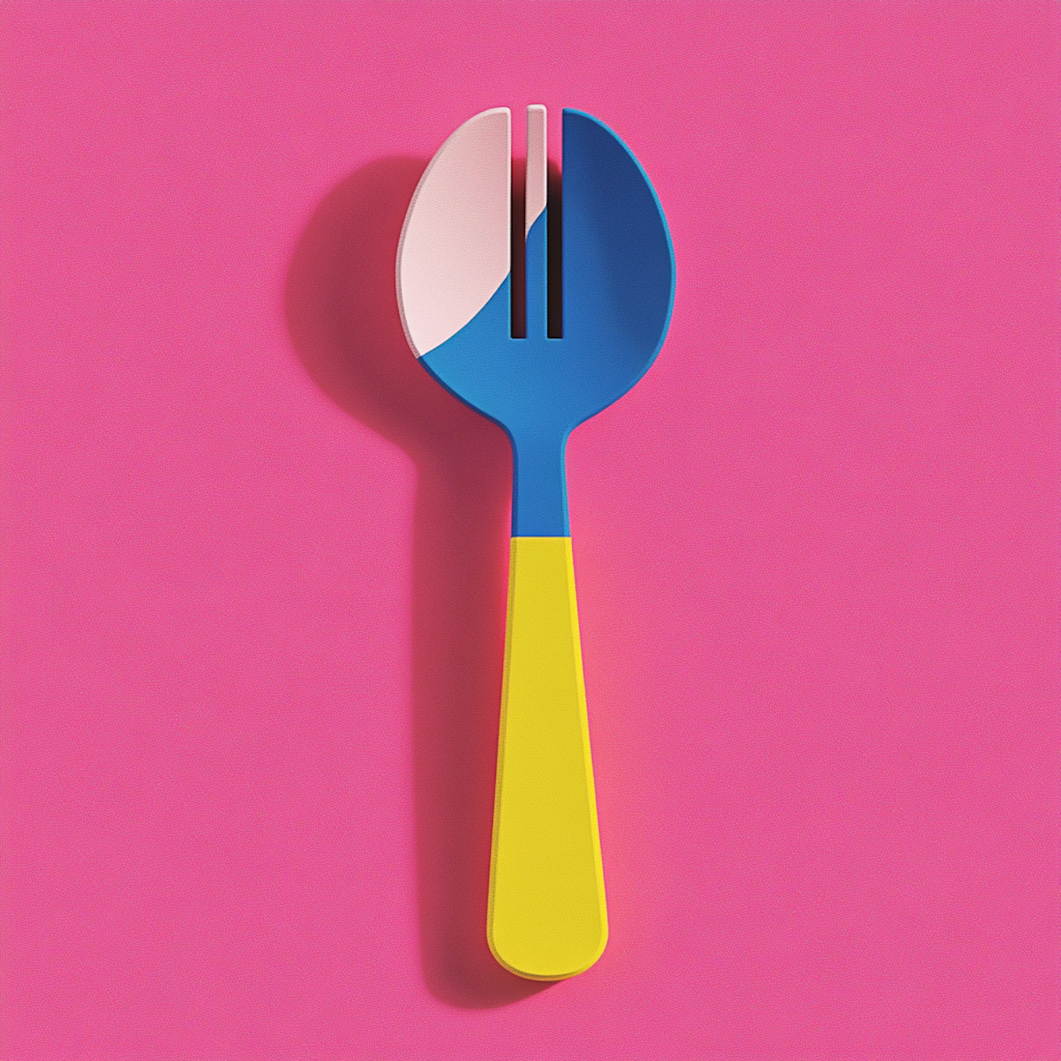 A vibrant spork with a yellow handle and blue-pink head on a bold pink background, blending playful design with modern aesthetics.