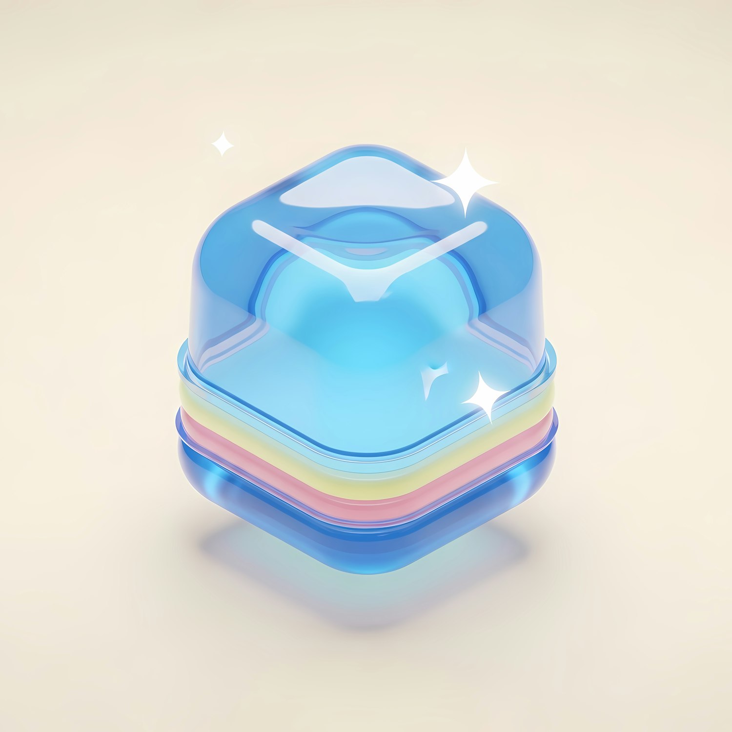 A stack of glossy, colorful, translucent square objects with rounded edges, layered in blue, pink, yellow, and green hues on a beige background.
