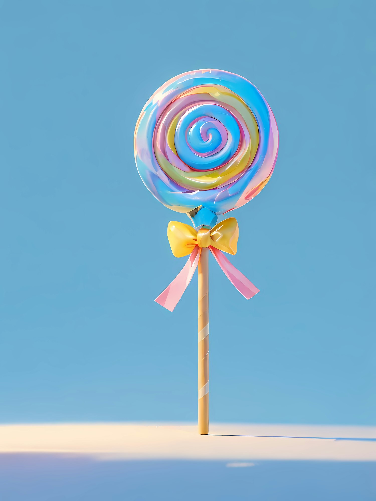 Bright swirled lollipop with pastel colors, a yellow bow, and pink ribbons on a striped stick against a light blue background.